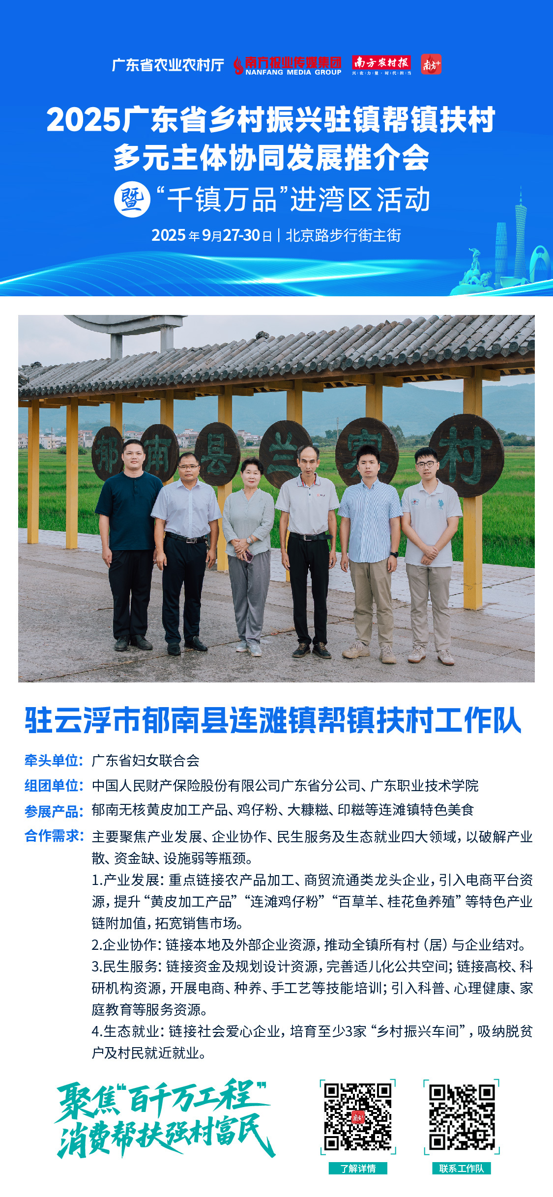 9月27日,为期四天的2025年广东省乡村振兴驻镇帮镇扶村多元主体协同发展推介会暨“千镇万品”进湾区活动(下称“活动”)将在广州市北京路步行街举行,届时工作队将带连滩镇特色产品与产业项目亮相,集中呈现帮扶成效的同时,为提升帮扶效力群求资源对接。